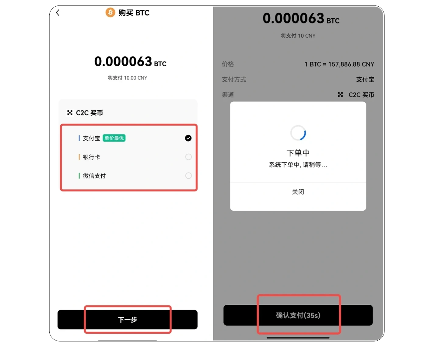 在“一键买币”页面选择卖家,设置购买金额并选择“微信支付”方式,按提示向卖家转账,对方放币后即成功入账。